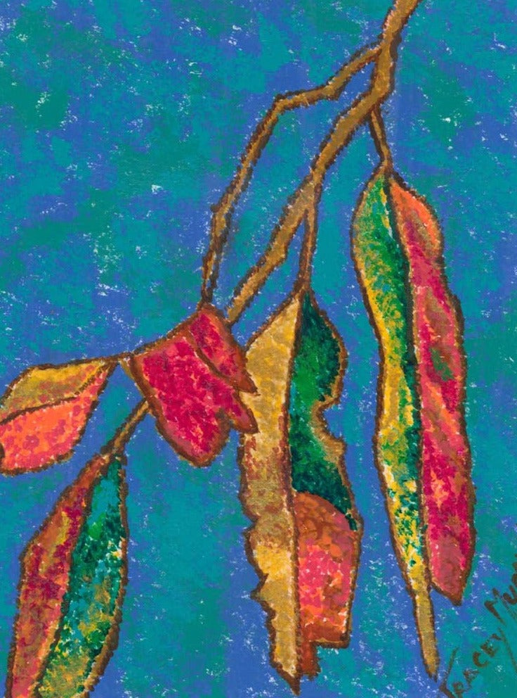 Eucalypts, like all Australian Flora are so unique. Their leaves can be as brightly coloured as a flower. Tracey created this pointillism artwork from one of the workshops in Widows Art Community. It was actually the latest version of her previous art, Gum Leaves which was in water colour.