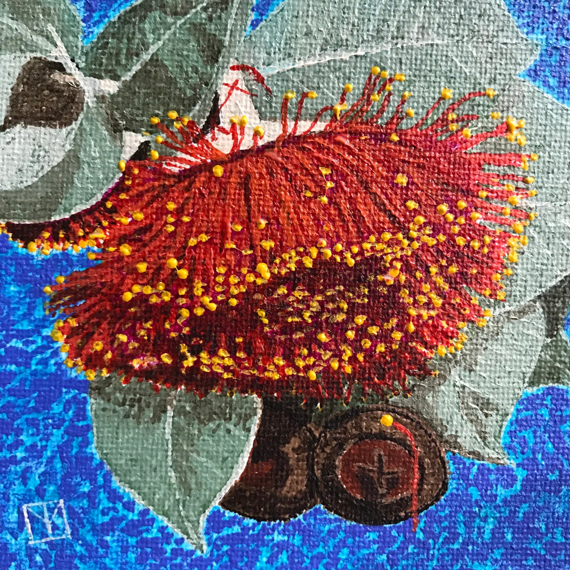 Tracey always wanted to do a painting of Gum Blossoms. She knew they were going to take a lot of time so put them off. This painting has taken approximately 10 hours to complete! Those pesky petals are tricky!