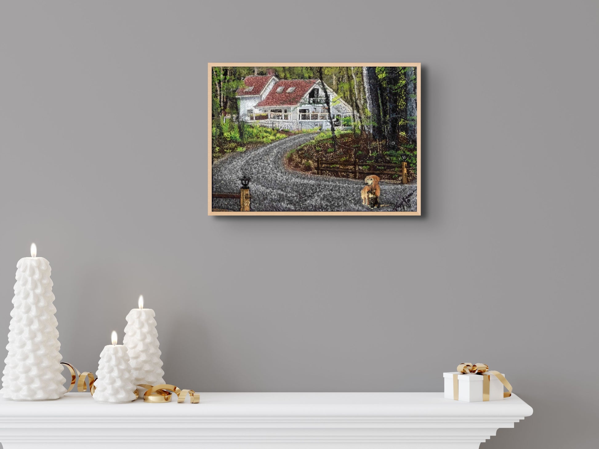 This unique pastel painting features a home in the forest with a friendly cat and dog. Its pointillism technique creates a dimensional effect that is sure to draw the eye. With vivid details, this piece will brighten any space and is sure to be a cherished work of art.