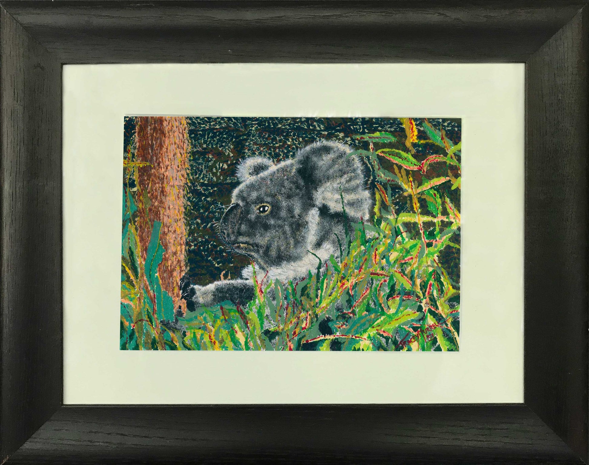 The painting depicts a koala surrounded by lush green foliage and showcases their beauty and uniqueness. The pointillism technique used by Tracey gives the painting a unique texture and depth. The bristle brush technique used by Tracey to create the furry texture of the koala’s fur adds a tactile quality to the painting, making it feel more lifelike and three dimensional.