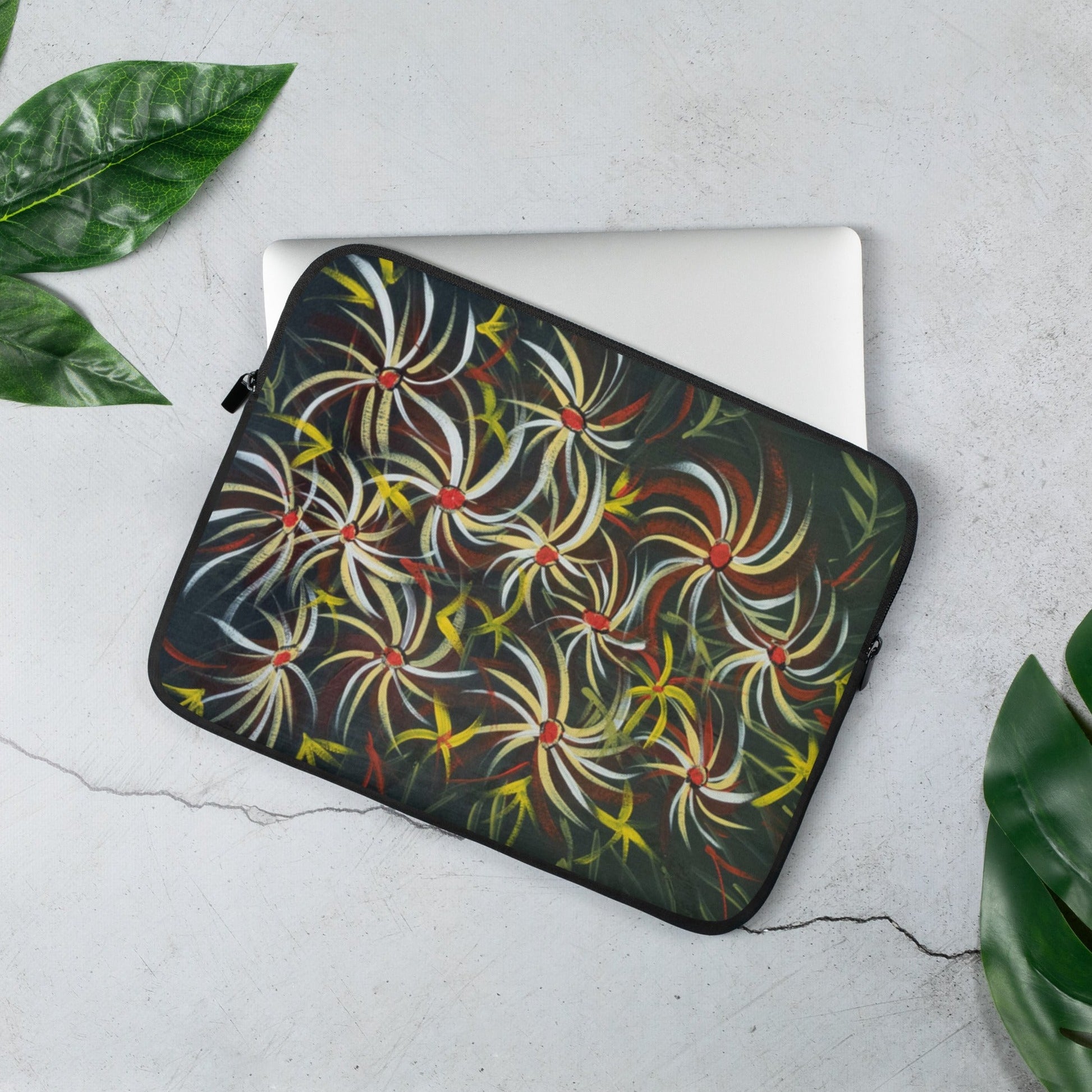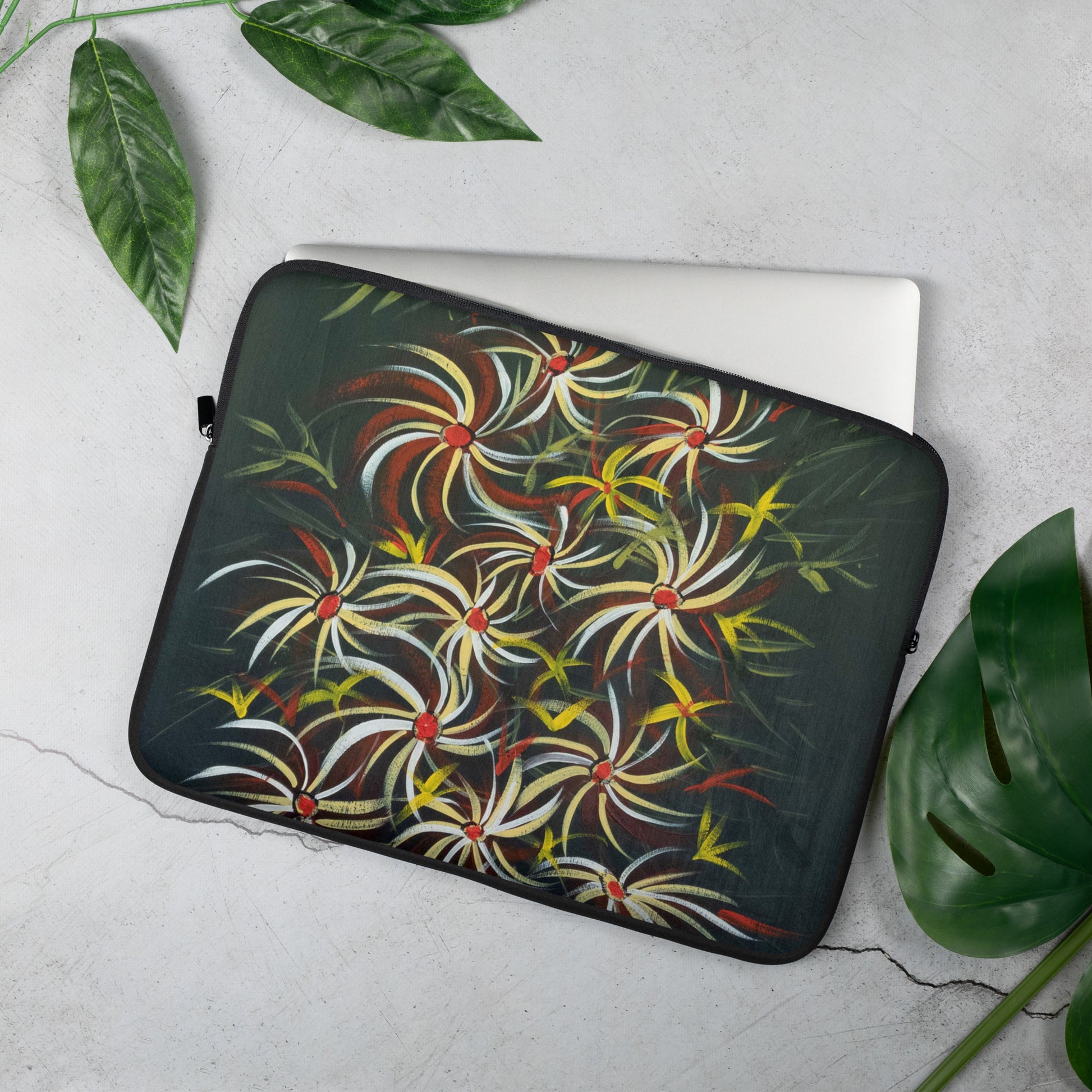 The Moonlight laptop sleeve showcases a stunning blend of colors and textures, with white, red and yellow flowers that stand out against a dark background. The vibrant hues and intricate details of the painting add a touch of sophistication and elegance to any laptop, while also providing a protective layer against scratches, bumps and other wear and tear.
