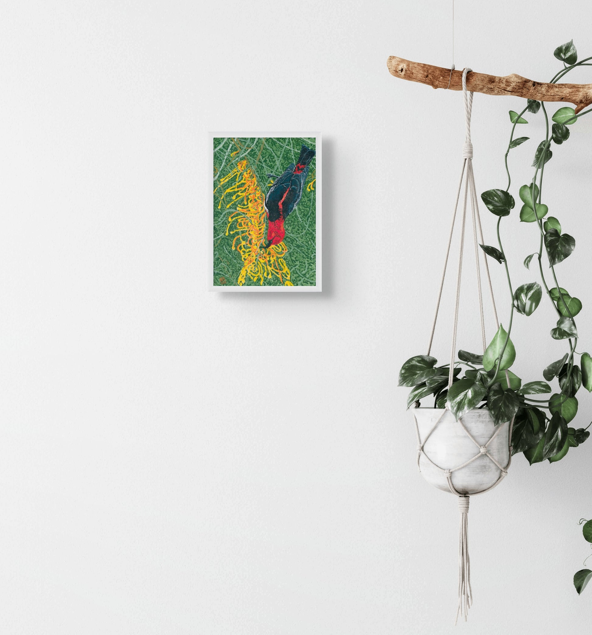 Out of My Heart a Bird Rose and Flew Skyward is the third painting in my Pollinator series. It was painted during workshops with the Widows Art Community (a group run by me). I love these little birds that seasonally visit and feed on trees outside my studio window. They feed on two trees, a red bottlebrush and the yellow grevillea. I chose the yellow grevillea for my painting so there was contrast between the bird and the flower. They are almost invisible on the red flowers!