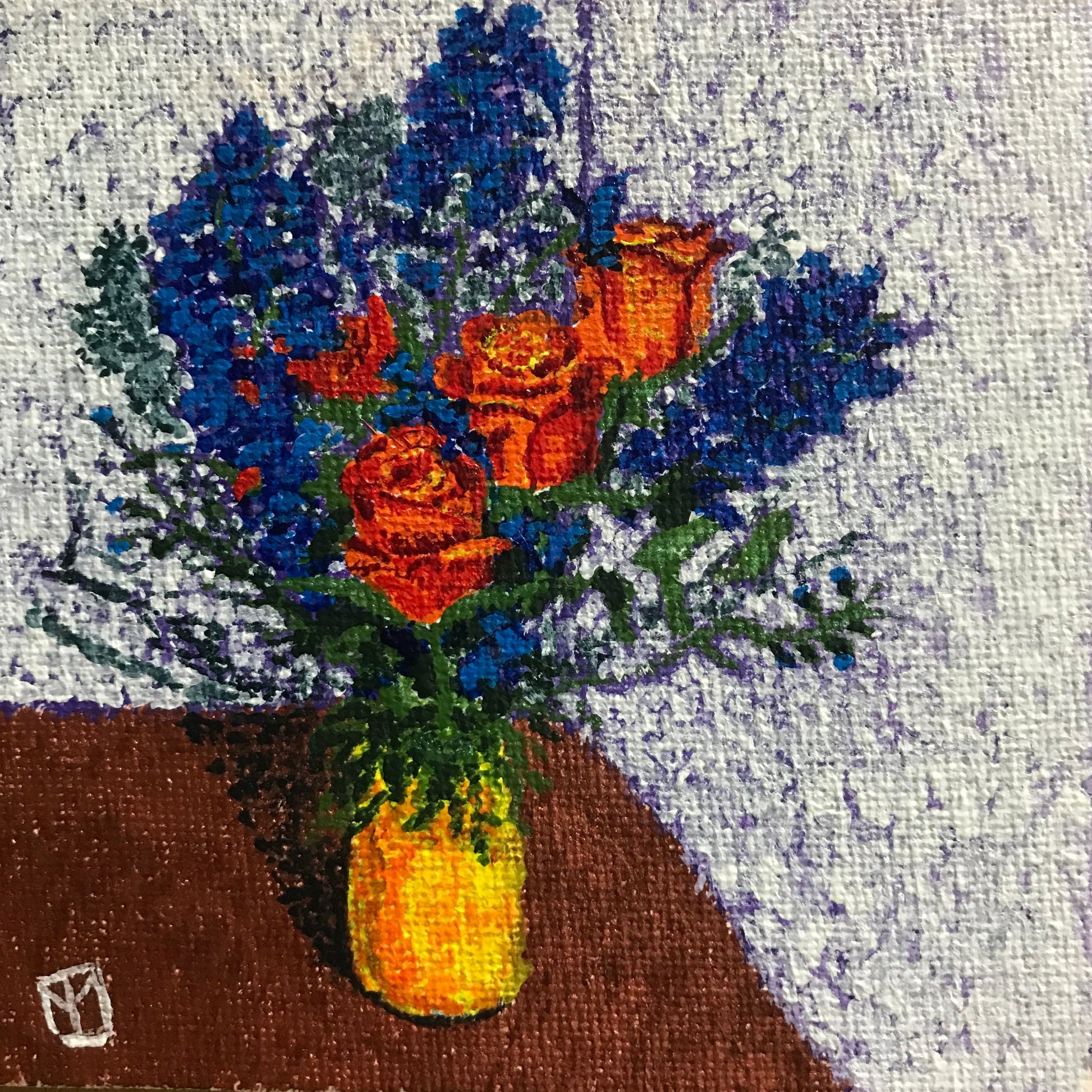 A vase of roses and delphiniums. This is Day 6 of Tracey's self-imposed challenge for Mother's Day 2023. Also done in pointillism, Tracey's favourite method.