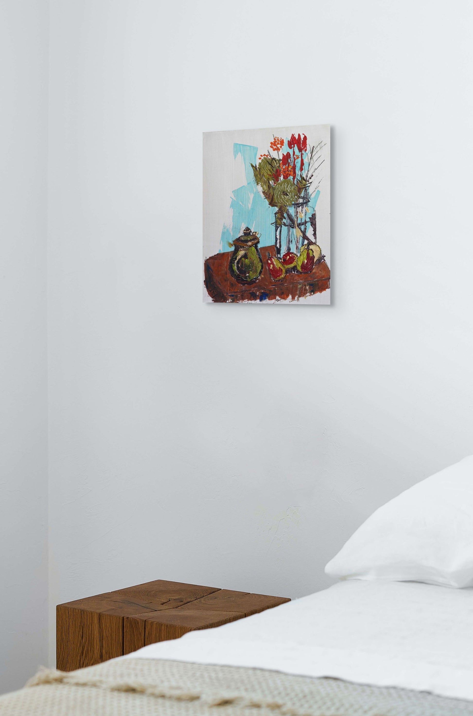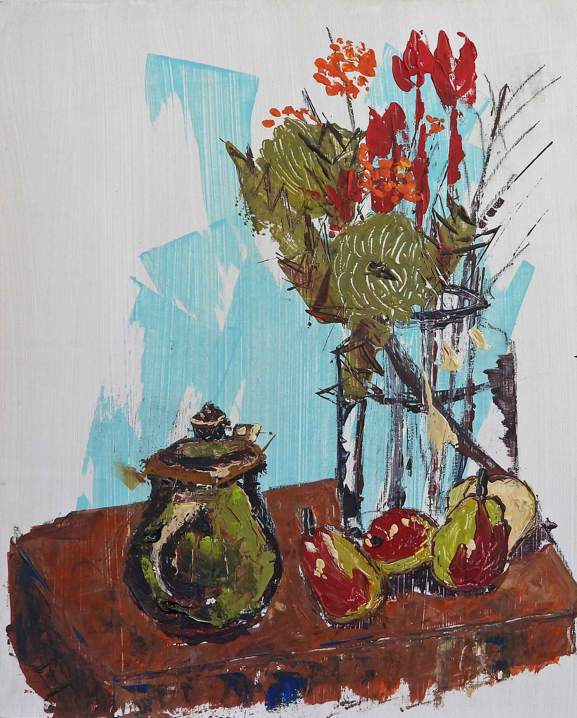 Tracey is exploring a new method of painting. The first, Still Life with Bottle, was painting from observation using her trademark vibrant colours. Still painted with a brush, it was moving away from her more recent works in a freer and looser style. Subsequently, Tracey painted Still Life with Coffee Pot using a credit card and palette knife. Getting even more loose in style. She followed these up with Still Life with Bowl of Pears and Still Life with Bowl of Limes that she painted simultaneously in this newer, looser style. All paintings were done from observation of still life arrangements. A palette knife and credit card forces the artist not to focus on fine details but capture the image in loose, bold strokes. Creating an impression of the subject rather than a detailed 'copy'.