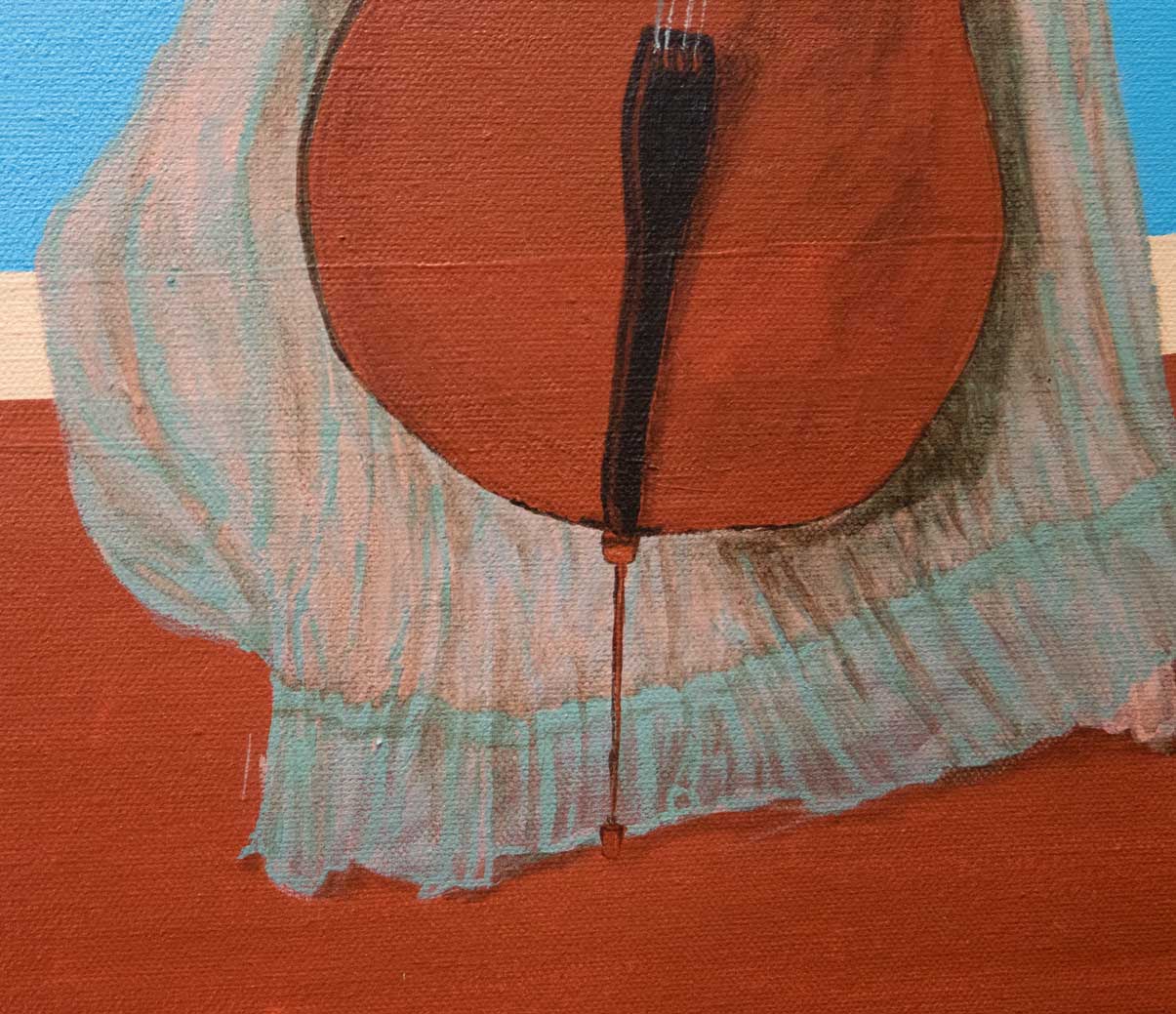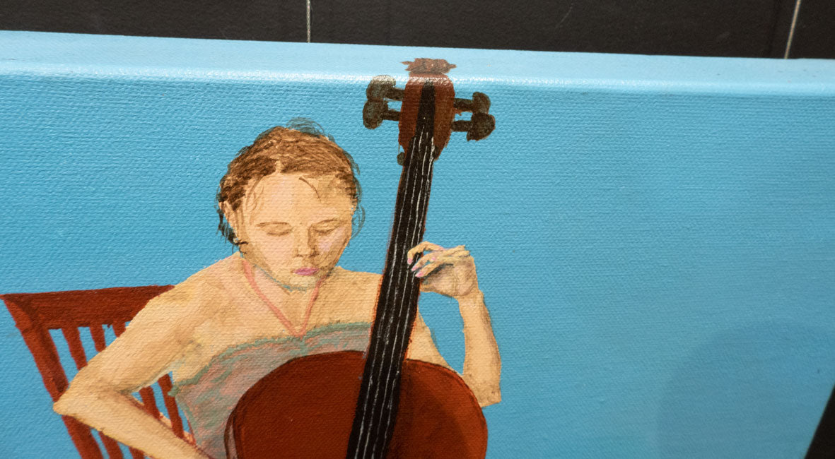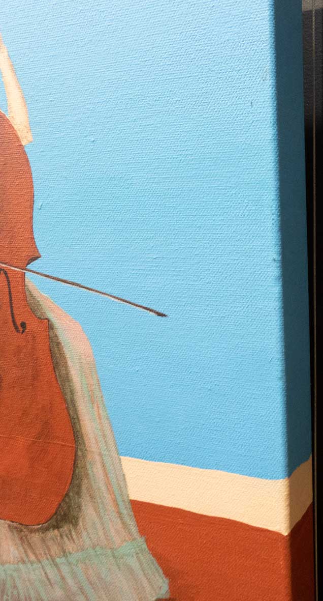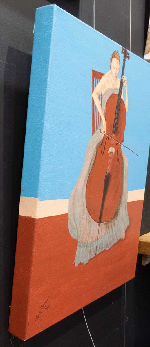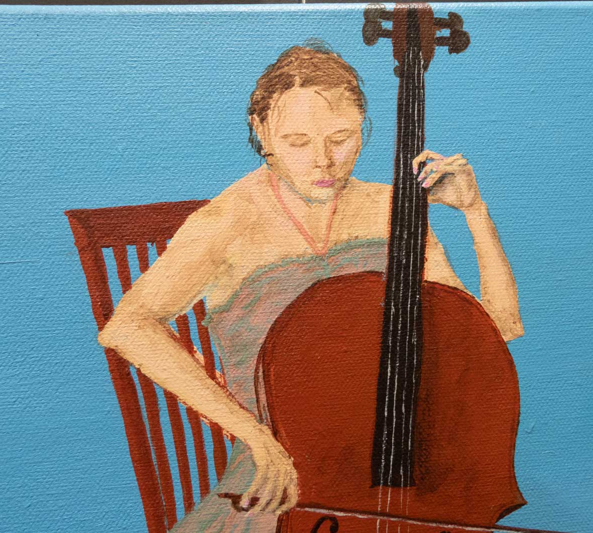 Tracey was helping her granddaughter do some homework and she had to find a photo of a cello. When Tracey found this photo online, she loved the translucent dress layers so much she had to paint it. She did it in a very contemporary style. Tracey has gone back to find this photo so she can credit the photographer but has been unable to do so unfortunately.