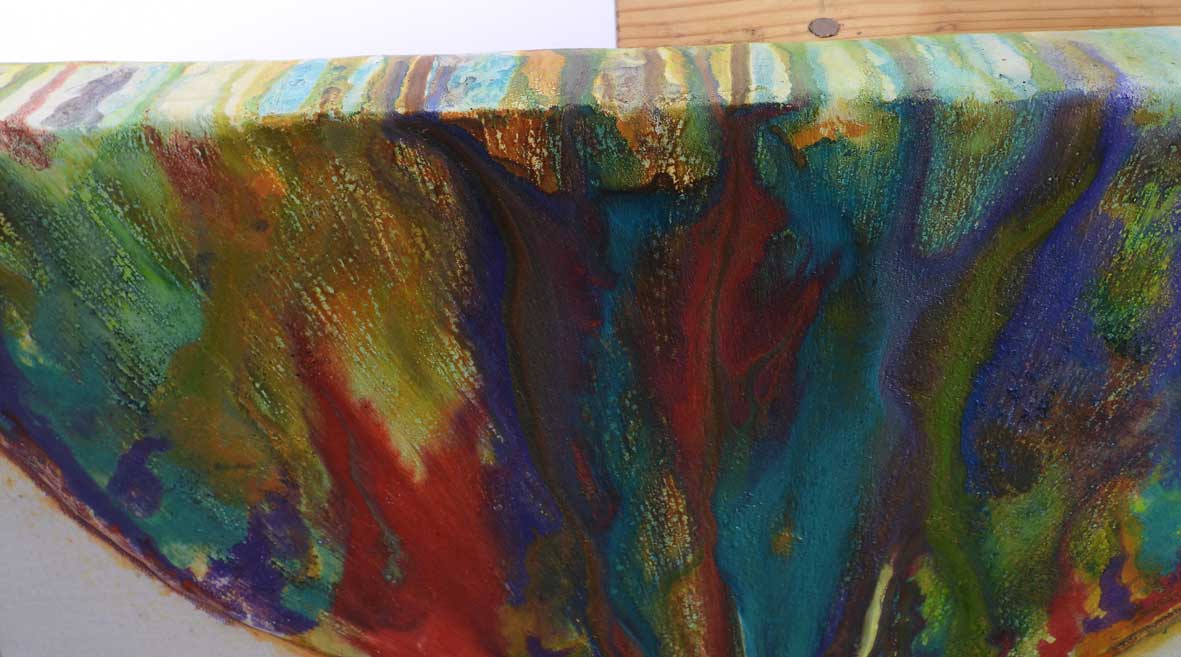 The Dyer is a unique 3D artwork on a deep-sided canvas, featuring freestyle sculpting of hands with a palette knife. Tracey, the artist, used her own hands as the model for this creation. Working on her non-dominant hand for the left side proved fine, but things got a bit tricky when she tackled the right hand, considering she is right-handed. Nonetheless, she achieved remarkable results. The vibrant colors, splashed with inks, create the illusion of dyes running down the cloth and over the dyer’s hands, with the excess escaping the edges. This 3D artwork offers a unique twist on the traditional painting process and is ready to hang, with sculpting that extends around the canvas edges.