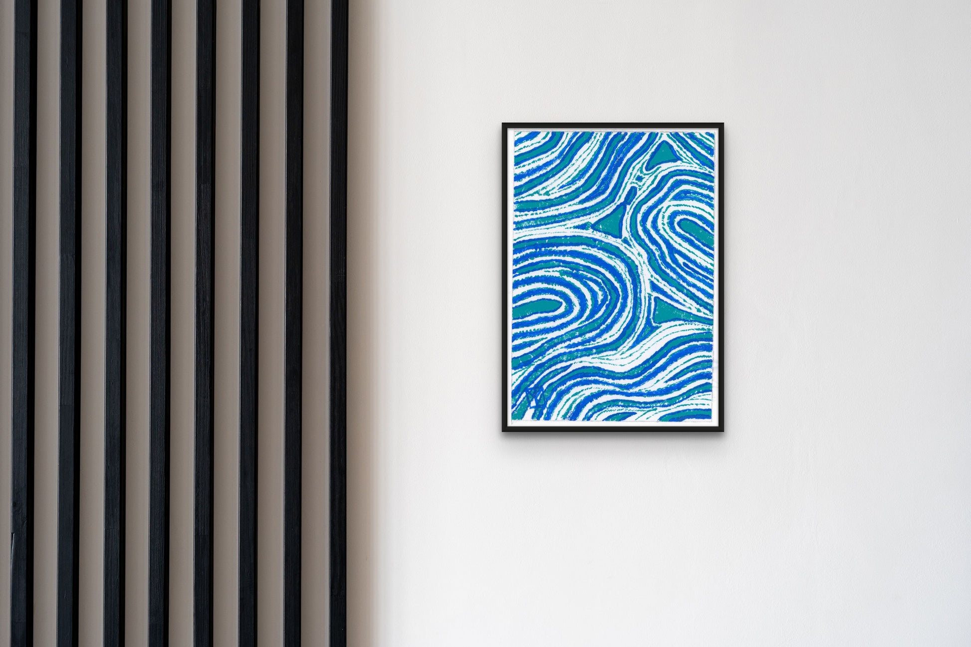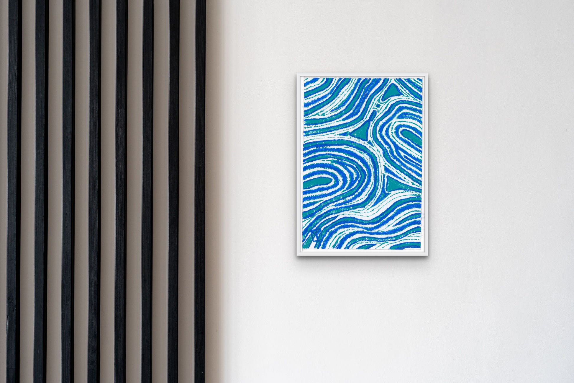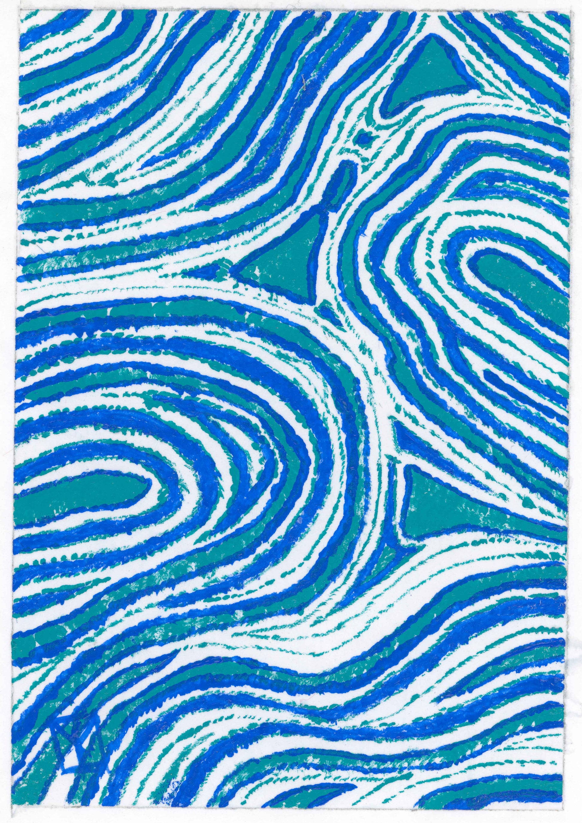 When commencing this work, Tracey didn't have any specific pattern in mind, she just let it flow and develop - almost on it's own. She decided to use a blue and an aqua simply because they are her favourite colours. As it was developing, Tracey saw water on the beach as it swirls in after a wave has broken - the Swash. This is an intuitive work. It's very soothing and would complement any modern home or office.