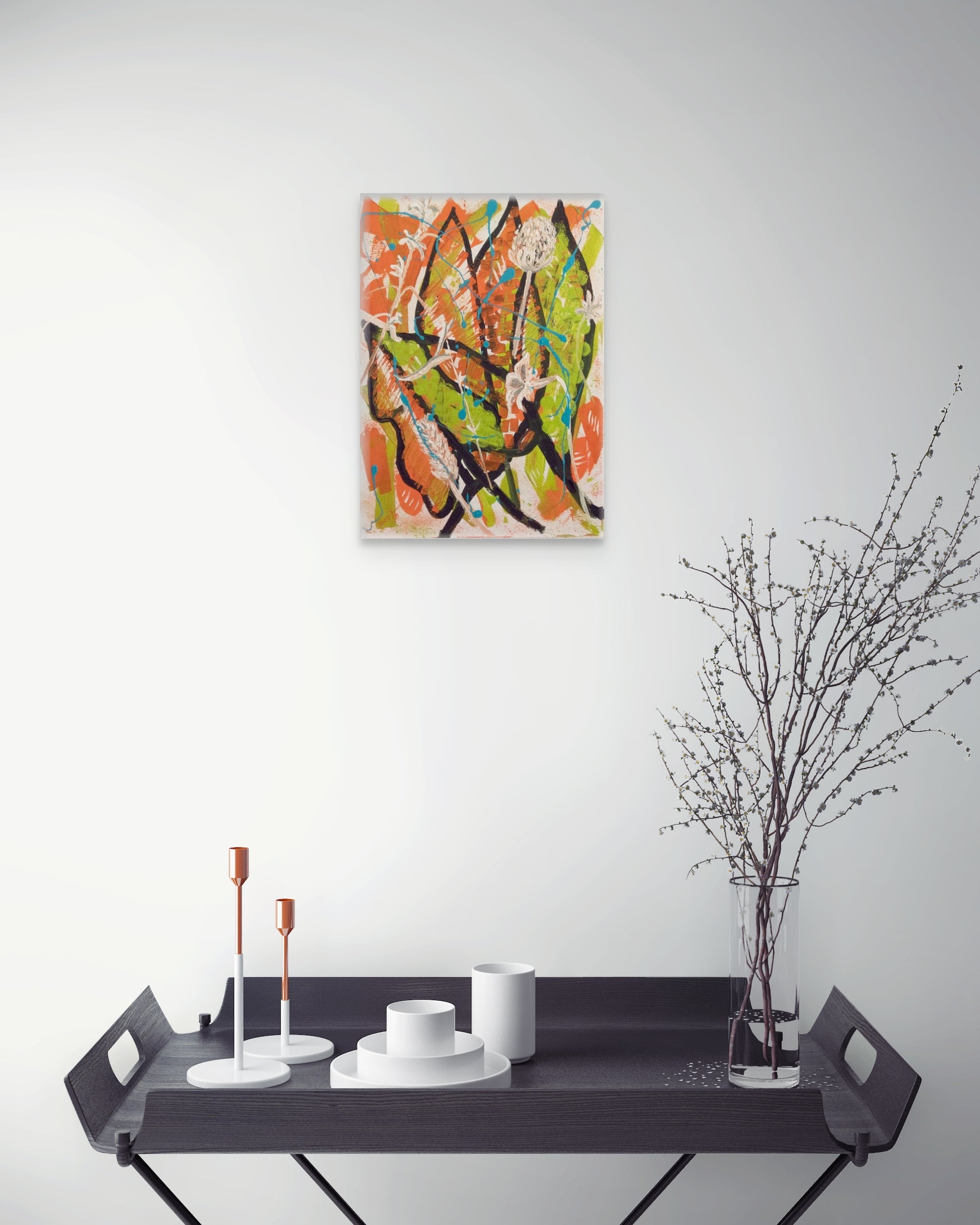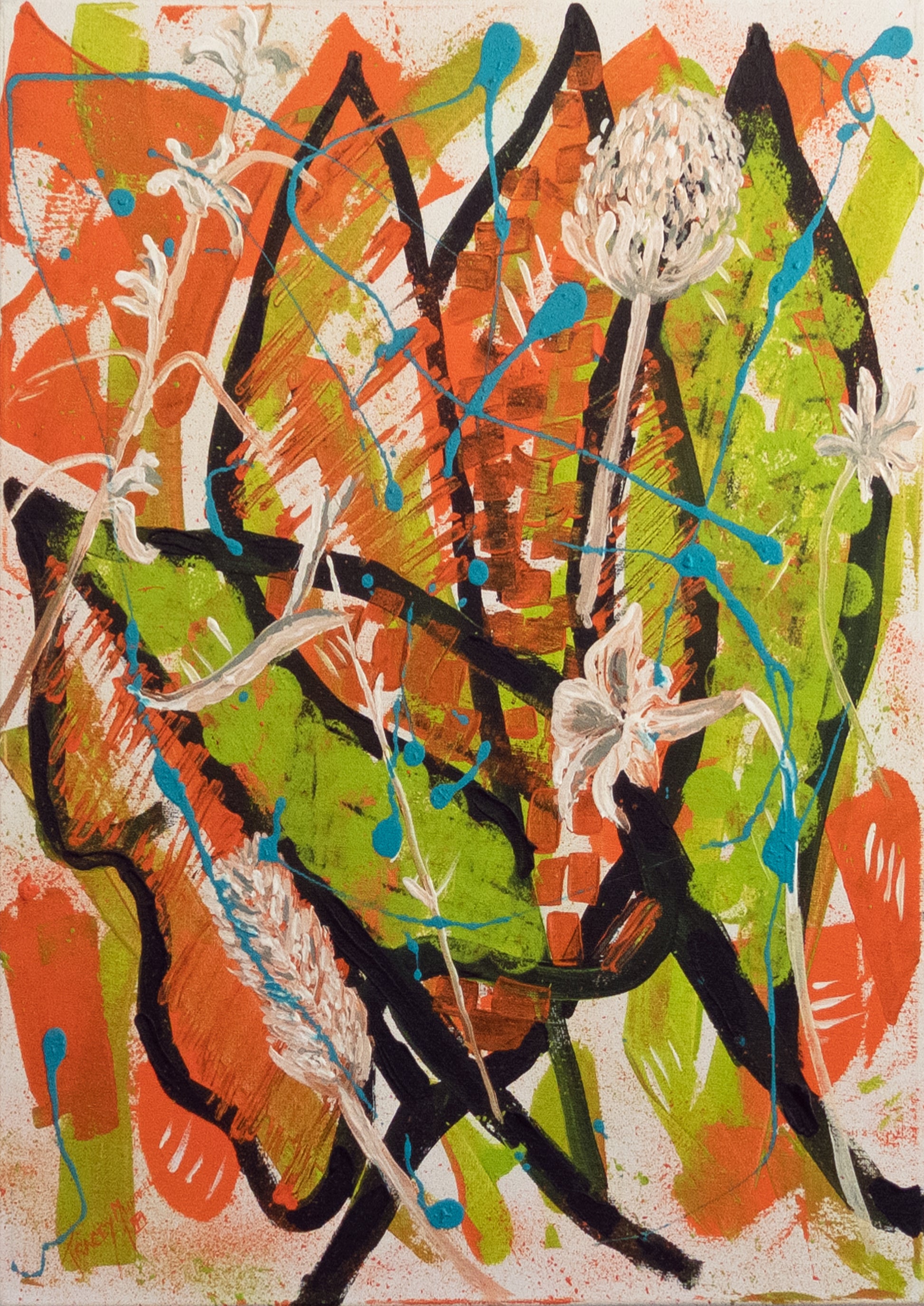 Abstract of Flowers with loose gestural marks. Tossed in the Air I has colours that simply pop out of the painting whilst Tossed in the Air II is a slightly more subdued, but no less colourful piece. These works were created as a pair using the same theme but intentionally different in tone and atmosphere.