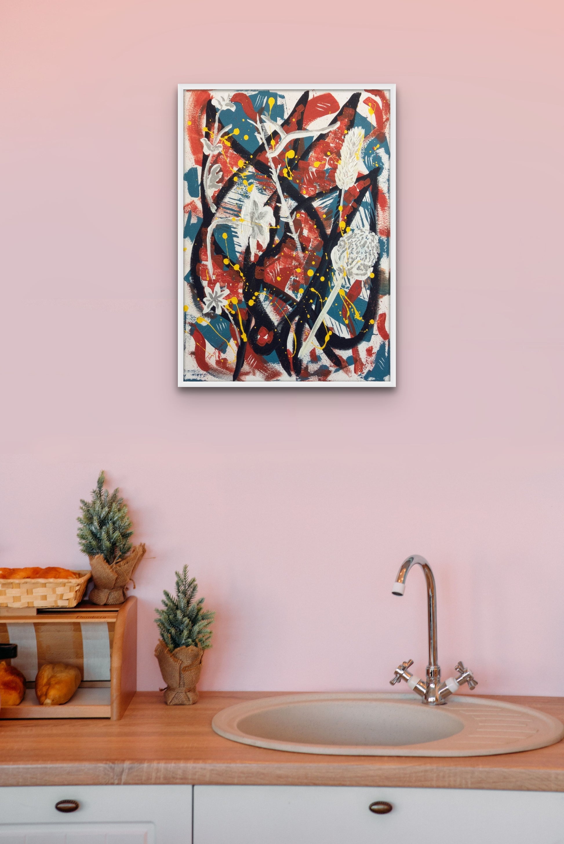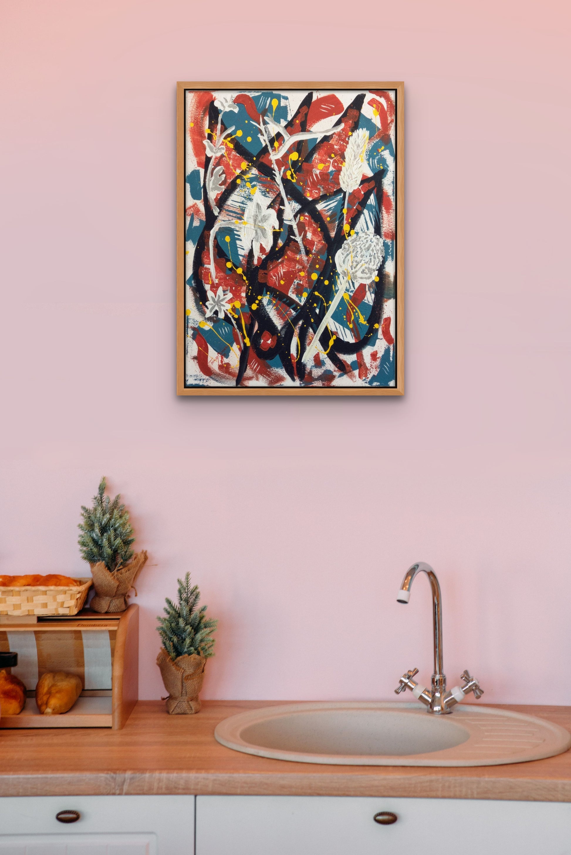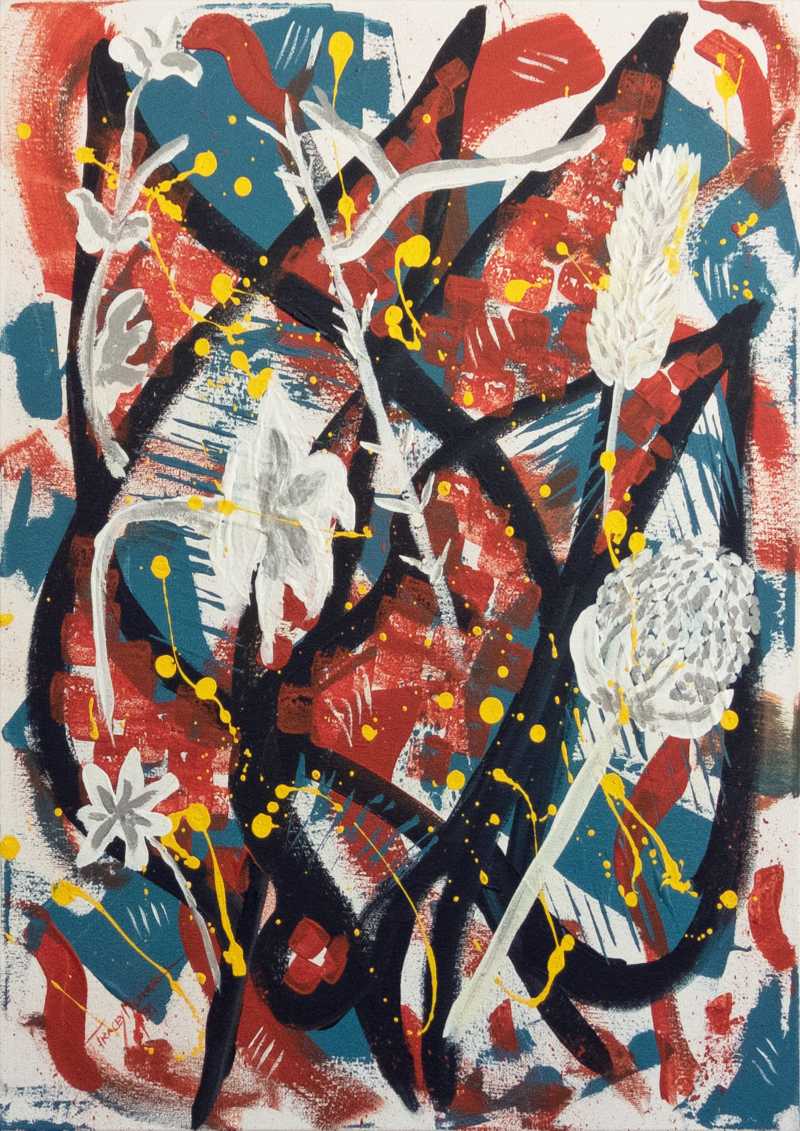 Abstract of Flowers with loose gestural marks. Tossed in the Air I has colours that simply pop out of the painting whilst Tossed in the Air II is a slightly more subdued, but no less colourful piece. These works were created as a pair using the same theme but intentionally different in tone and atmosphere.