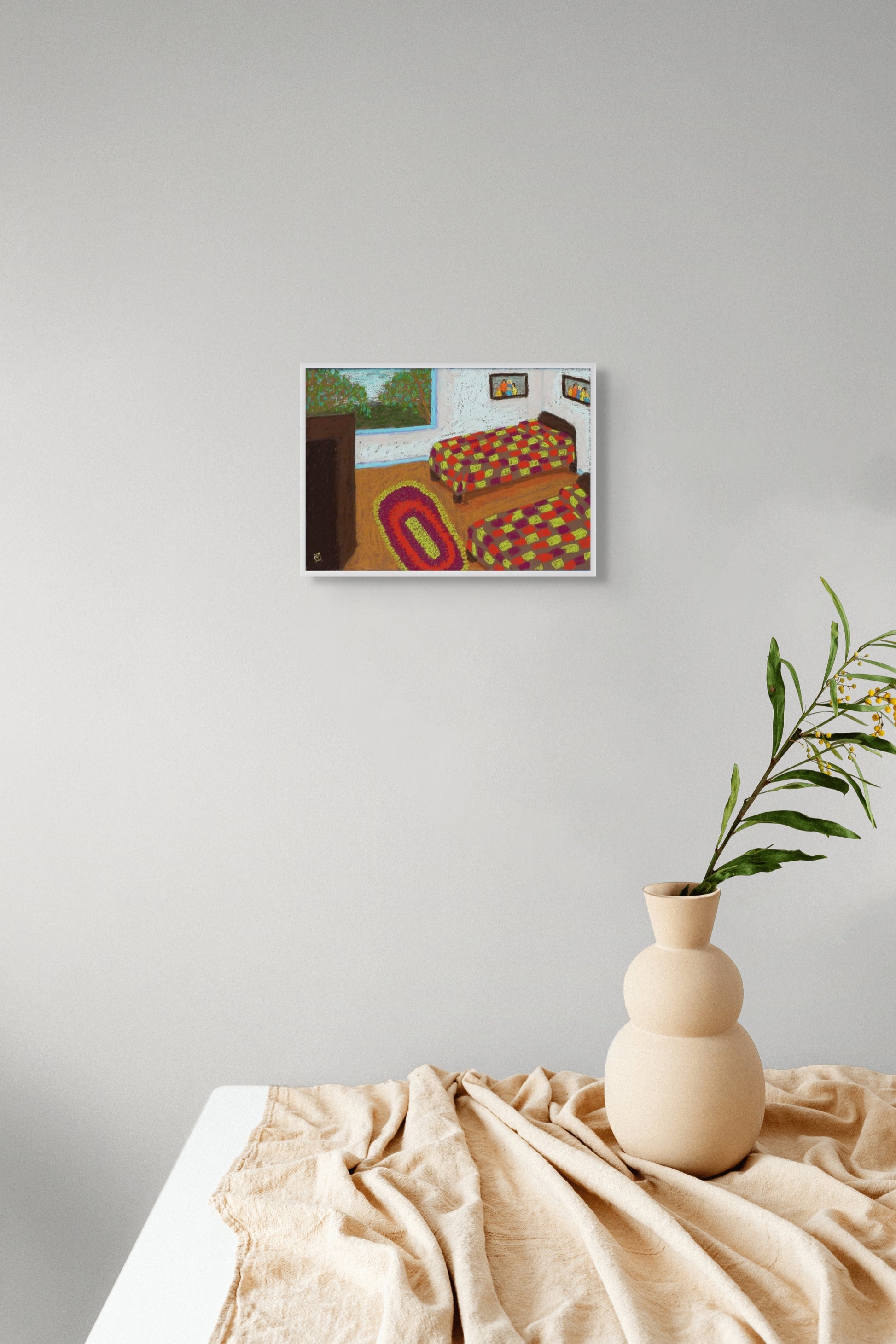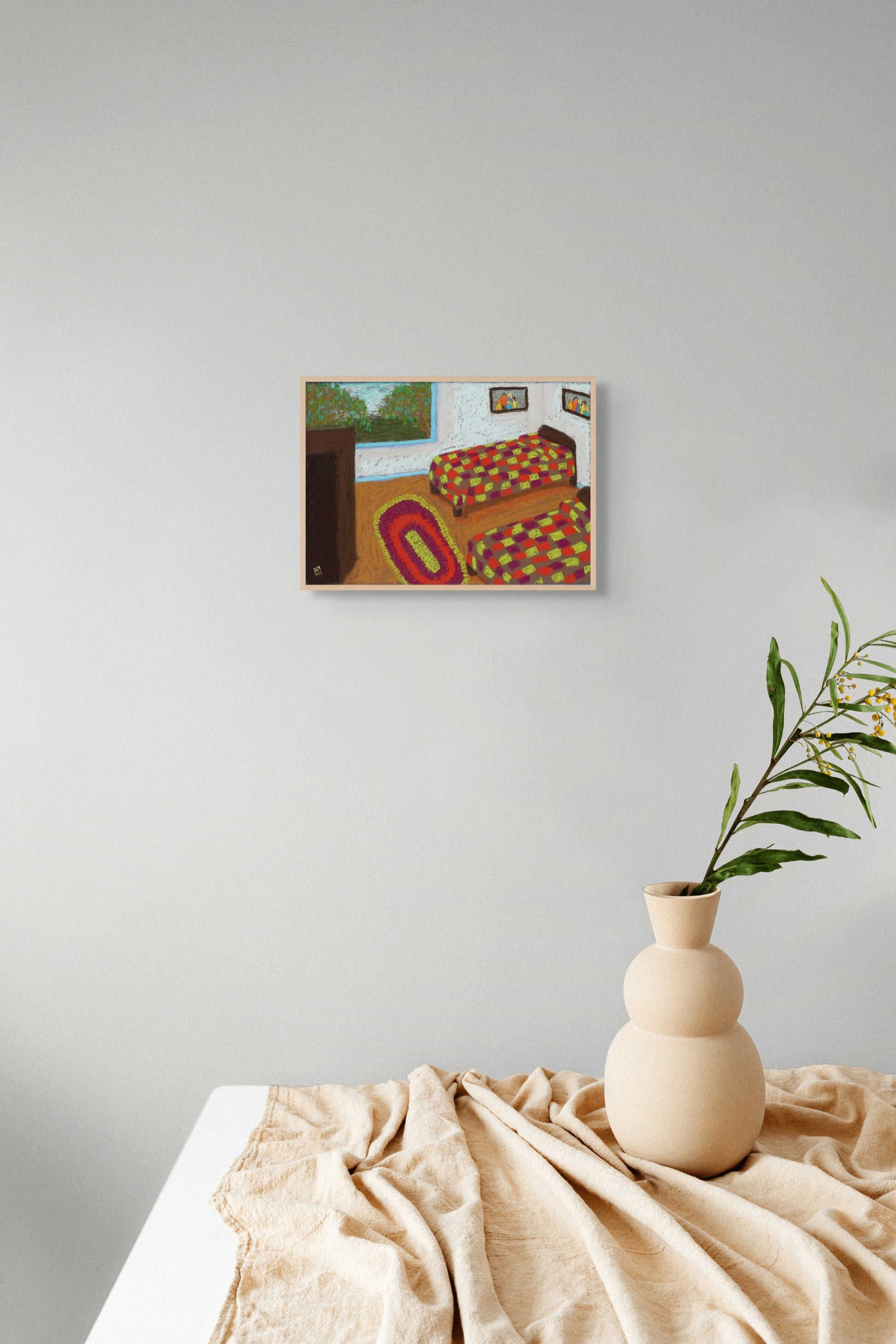 Twin Beds was created out of Tracey's head. Her sister gifted her 4 new Sennelier pastels and she wanted to use them. The image of the Twin Beds with their brightly coloured crocheted bedspreads and the rag rug in a drab room just came to her. Later, the family photos on the walls appeared as so many elderly have their children and grandchildren's pictures adorning their homes. The large window looking out on the garden is probably a little out of character for the room but it was part of the original vision Tracey had. An indication of the gardening that is also part of the lives of the 'retired'. This work was reminiscent of a couple that were part of Tracey's family a long time ago.